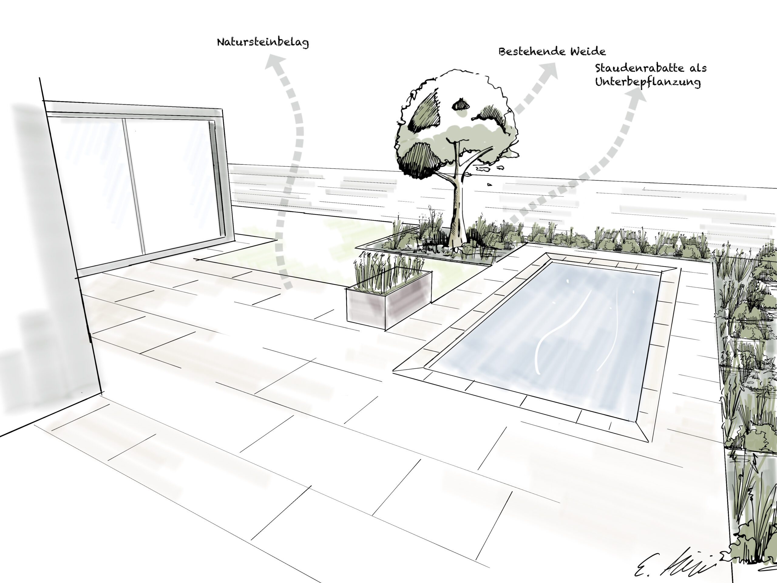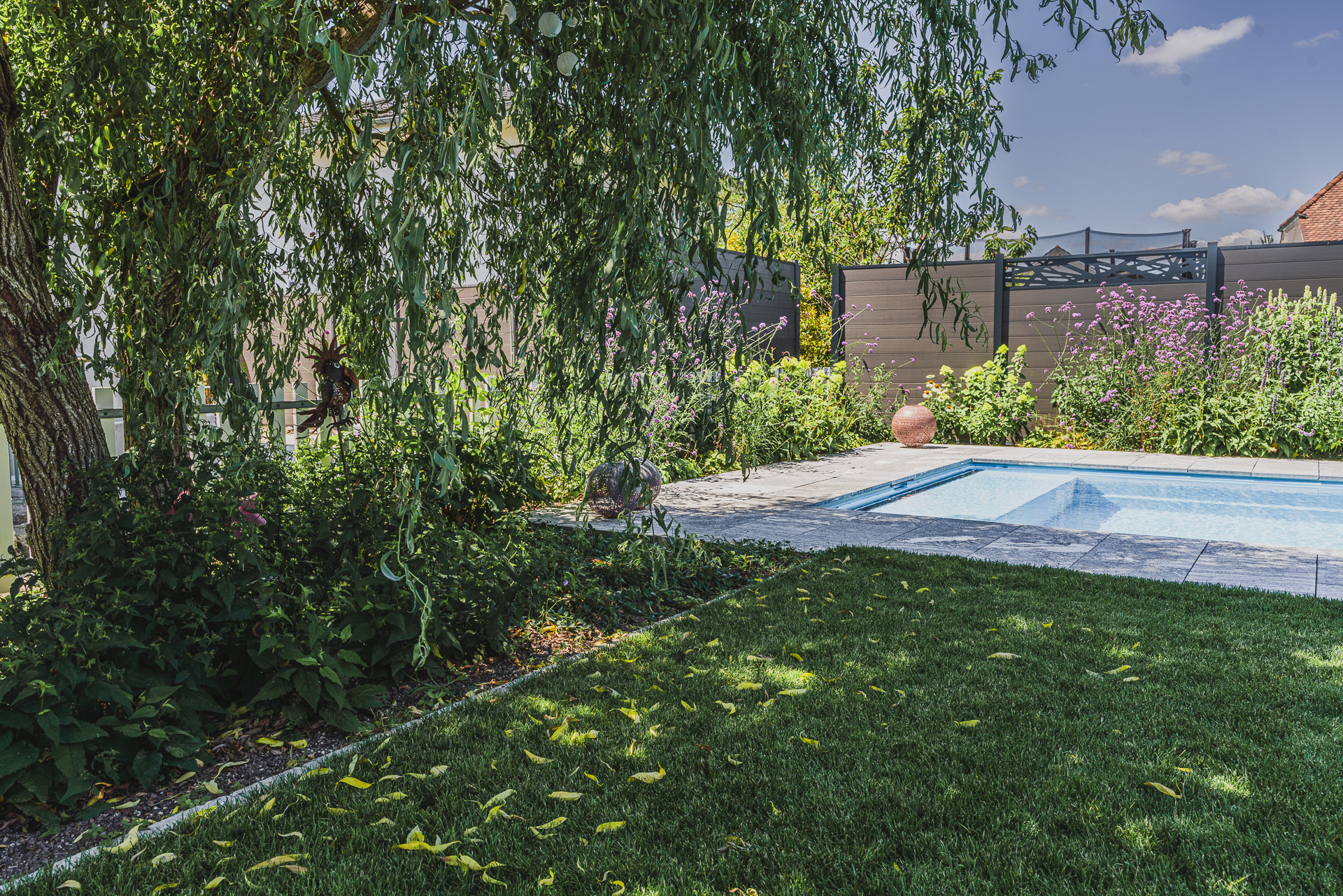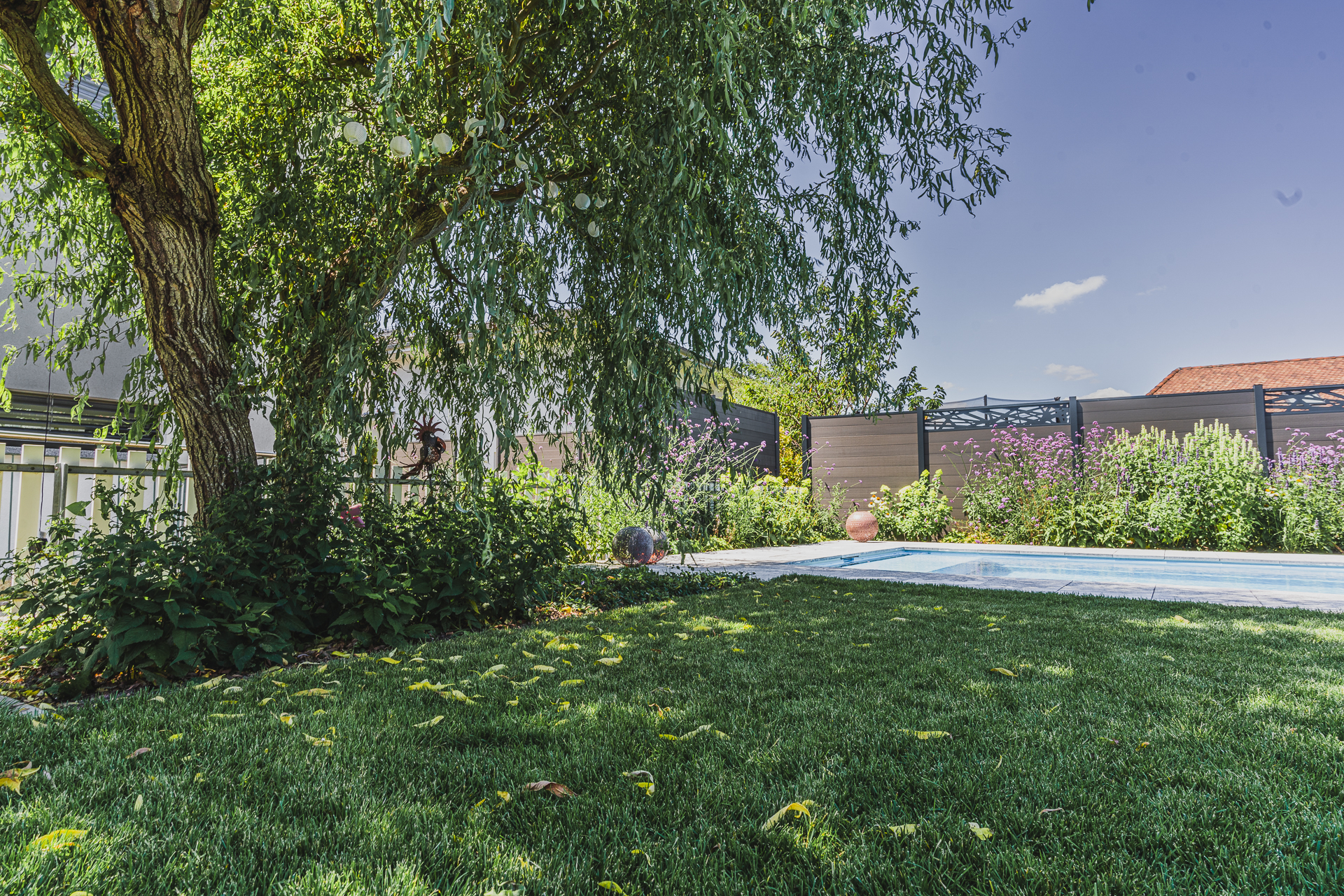 Die bestehende Trauerweide blieb als prägendes Element erhalten und wurde bewusst in das neue Konzept integriert. So verbindet sich der alte Charme des Gartens mit einer neuen, zeitgemässen Gestaltung.