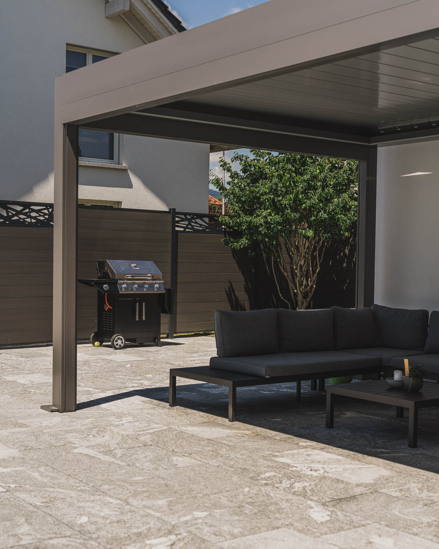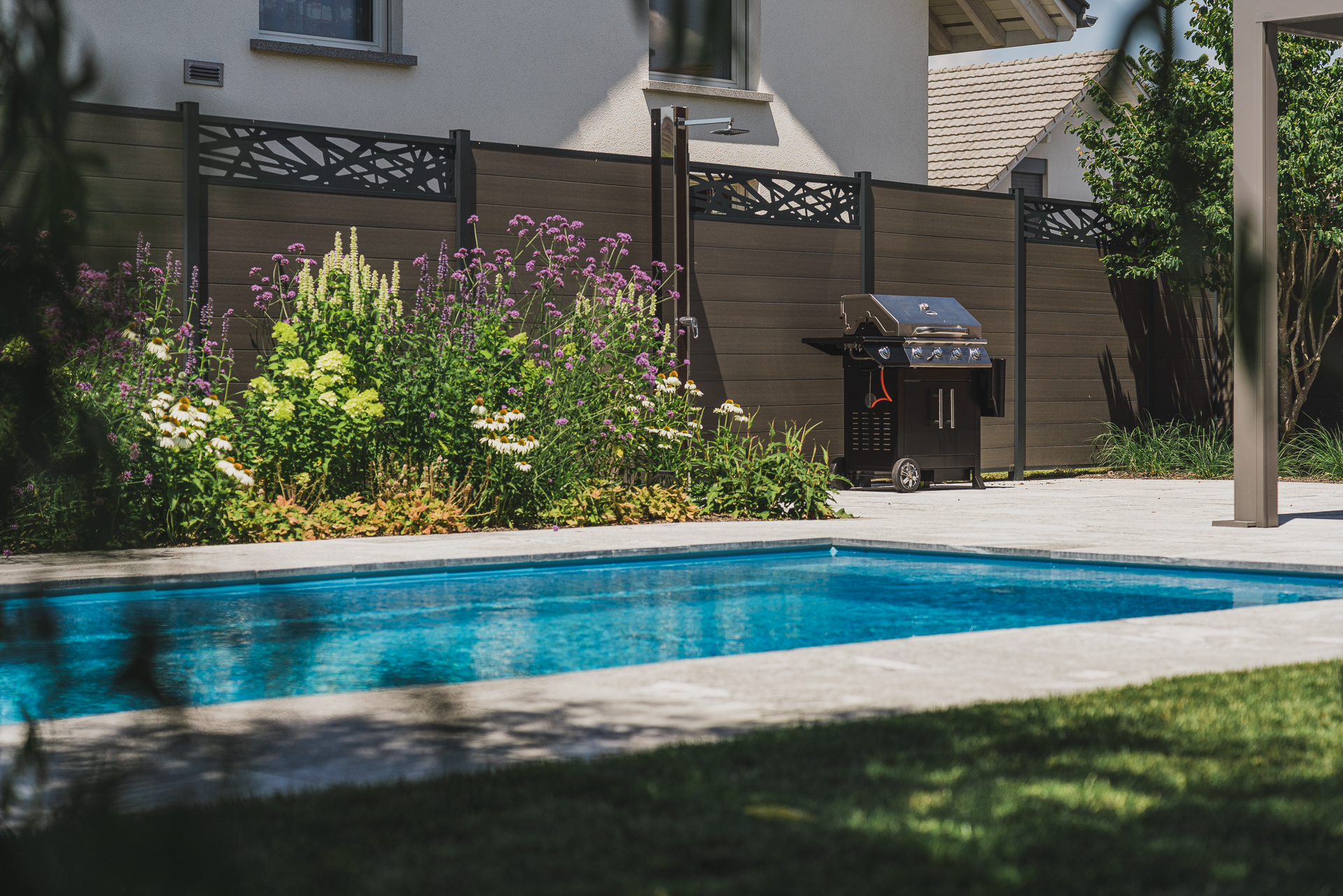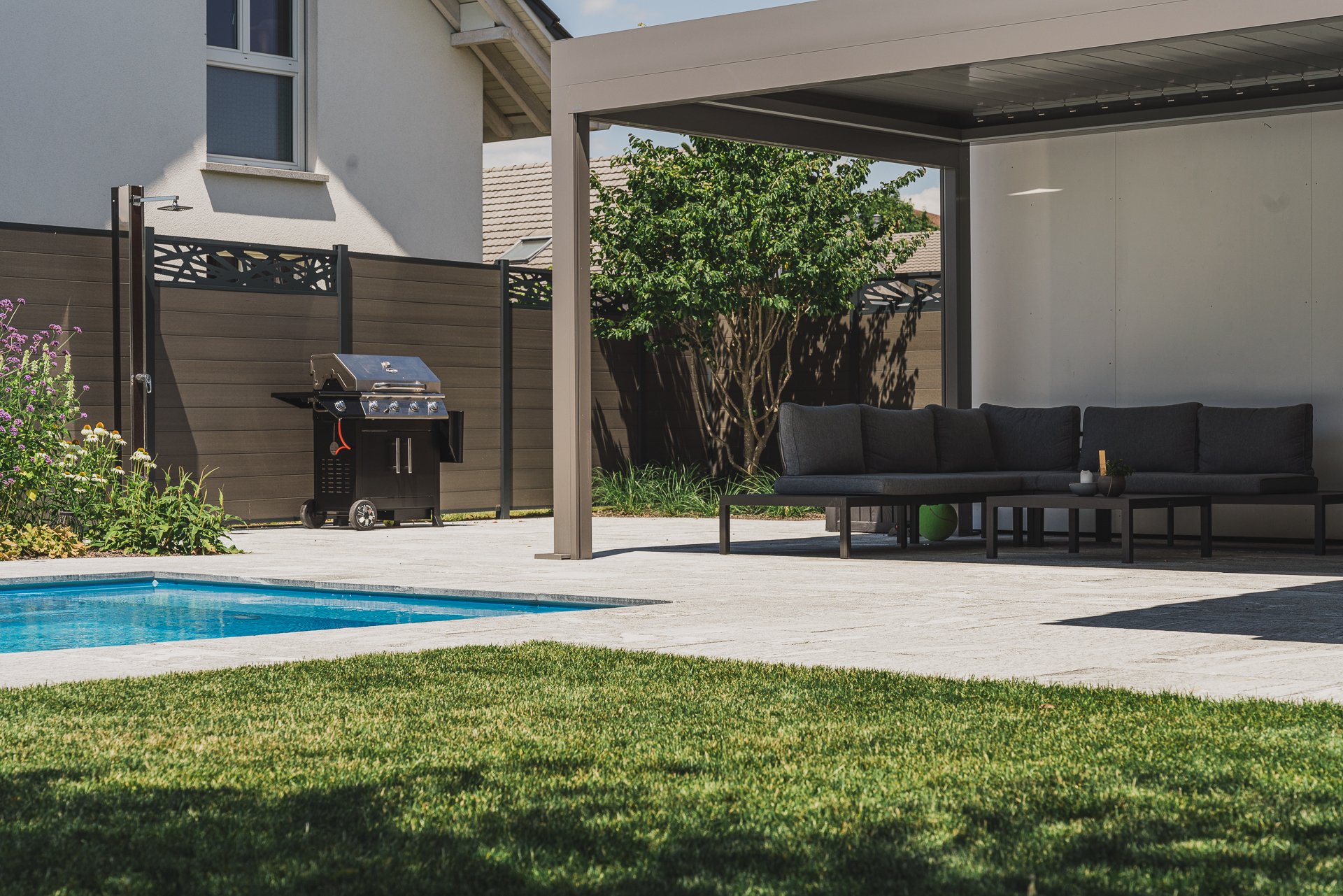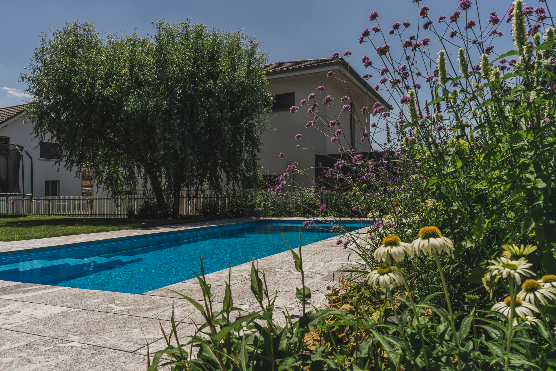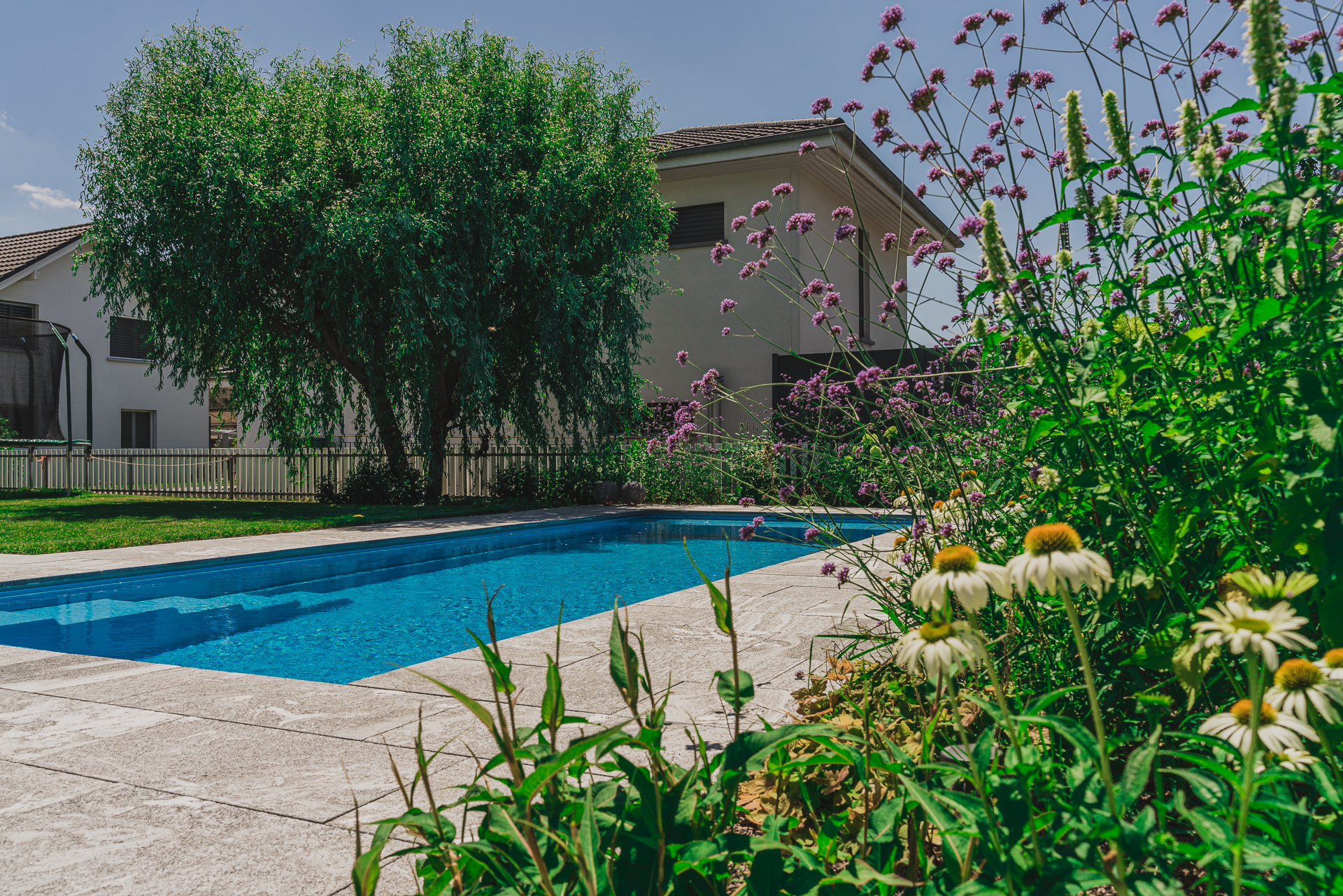 Staudenrabatten sorgen für Farbe und Struktur im Wechsel der Jahreszeiten, während die Pergola einen geschützten Ort zum Verweilen schafft – perfekt, um den Garten in vollen Zügen zu geniessen.